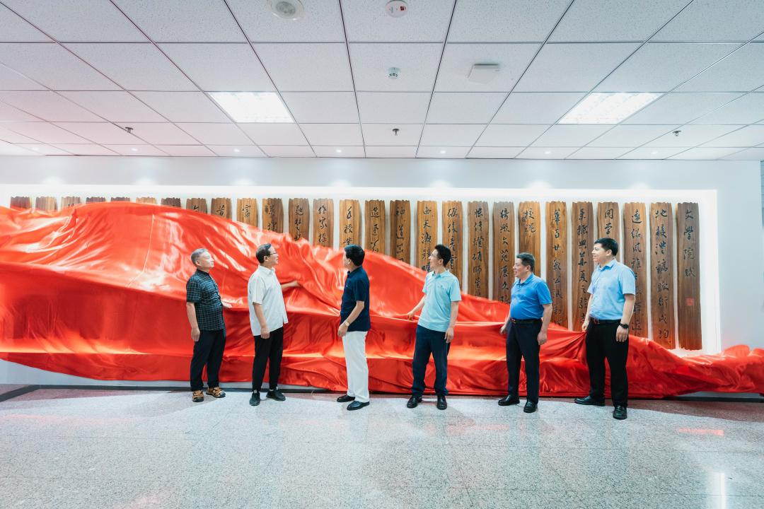 在热烈的掌声中,崔延力处长、谷鹏飞院长、书法家岳峰教授,以及《76net必赢官网赋》主创人员刘卫平、丁科民、姚敏杰等校友代表共同为形象墙揭幕。