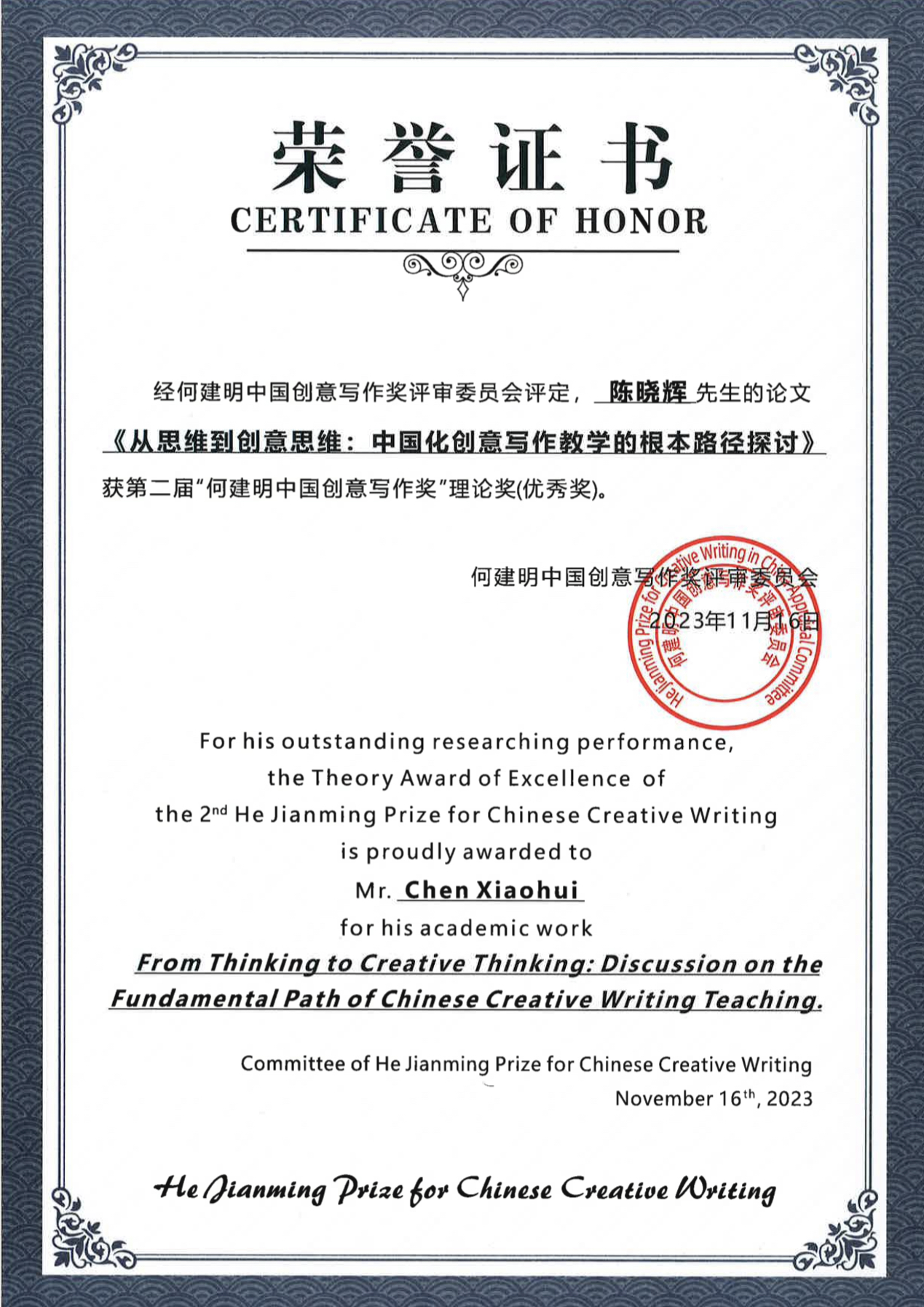 我院陈晓辉教授的论文《从思维到创意思维:中国化创意写作教学的根本路径探讨》获得“何建明中国创意写作奖”的理论奖(优秀奖)。