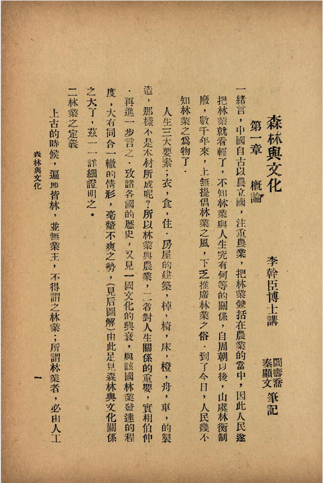 《森林与文化》 李幹臣博士讲;阎寿乔、秦显文笔记
